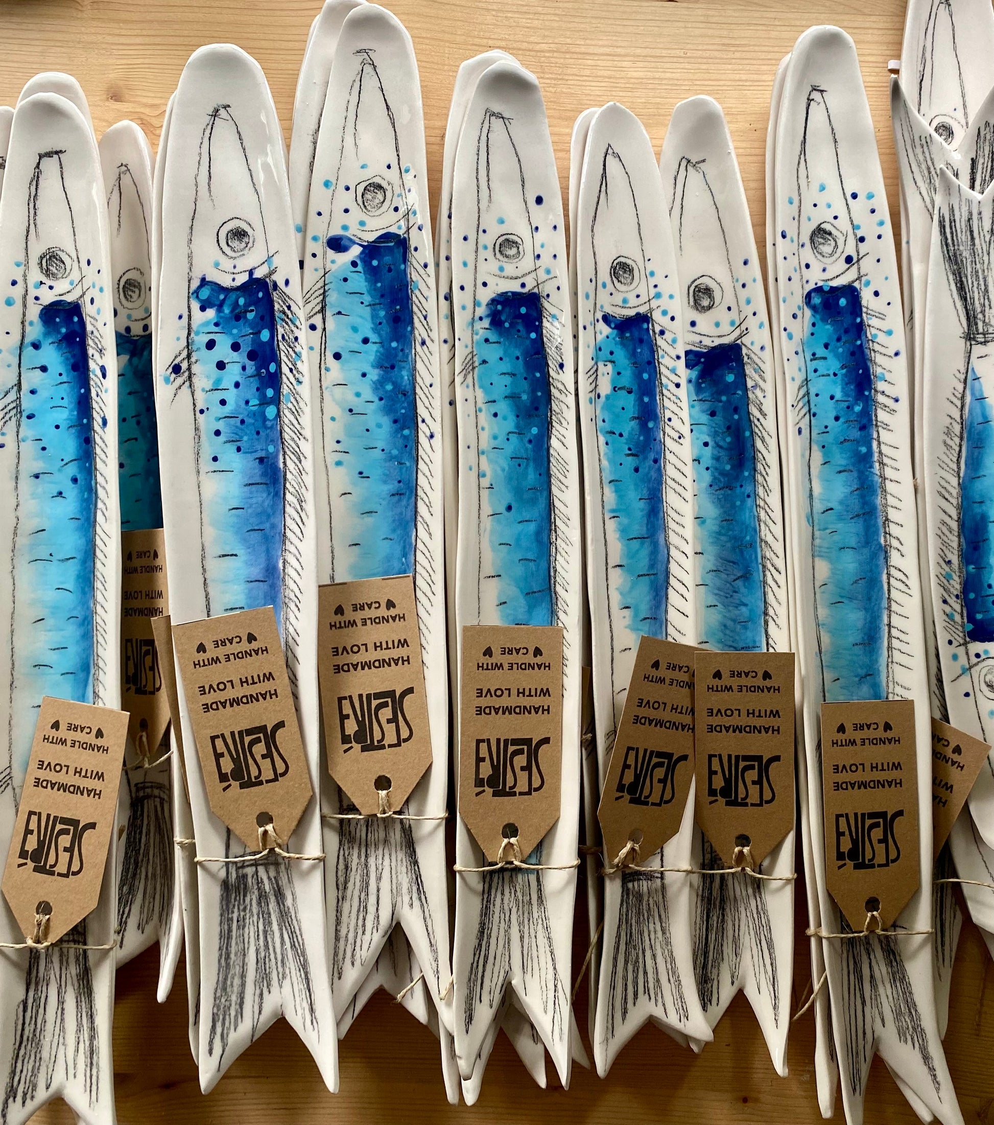 This narrow fish-shaped plate is hand-built and hand-painted, making each piece one of a kind. Versatile in use, it can serve as a decorative accent or as a unique way to present olives, capers, sushi, or other small bites. Available in sizes from 20 to 40 cm.